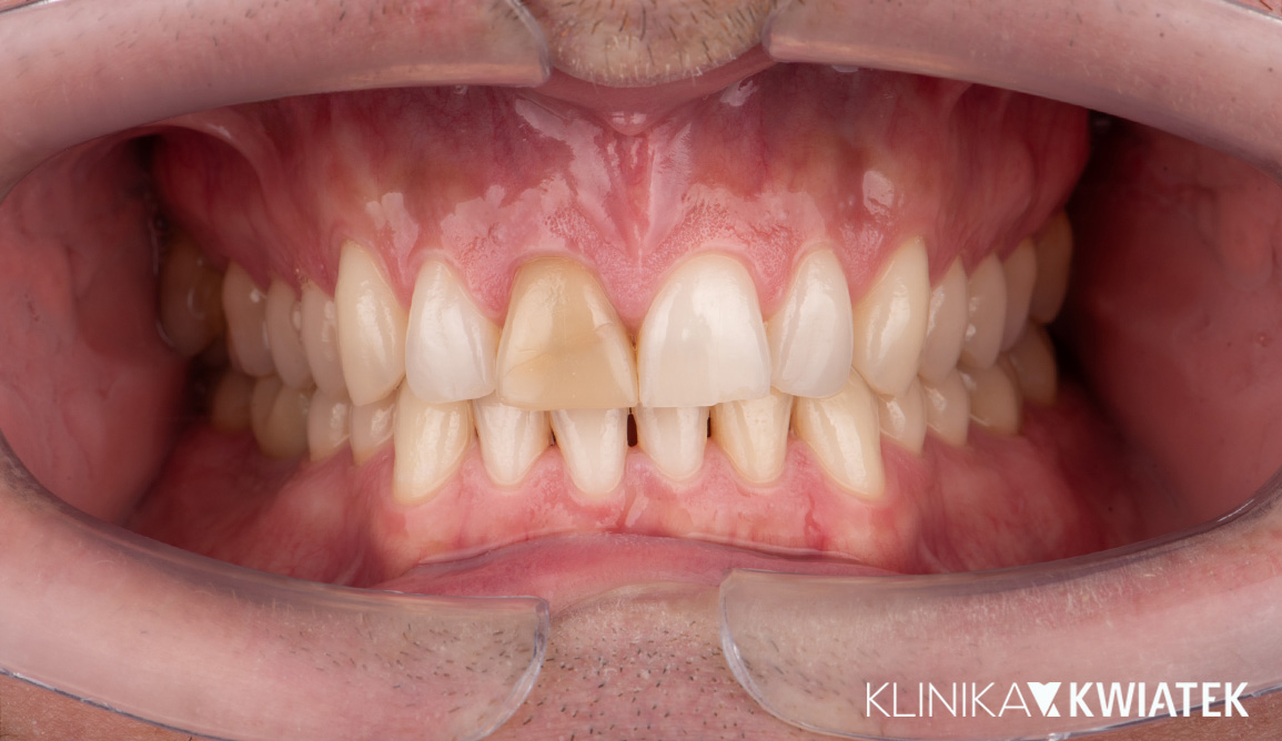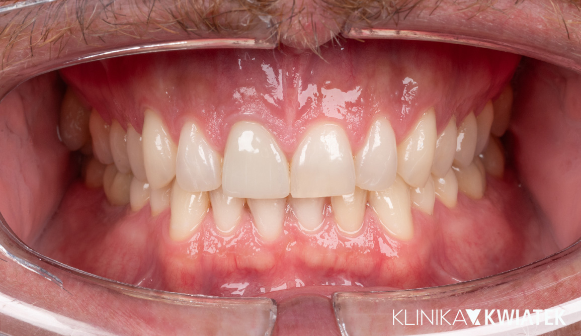 Pacjent zgłosił się z powodu ruszającego się mostu oraz bardzo starych koron wykonanych ponad 20 lat wcześniej, którym towarzyszyło znaczne obniżenie poziomu dziąseł i nieprawidłowe warunki zgryzowe. Leczenie obejmowało kompleksową diagnostykę, usunięcie przestarzałych prac, leczenie chirurgiczne, implantologiczne, endodontyczne oraz pełną rekonstrukcję protetyczną. Efektem jest stabilny, funkcjonalny i estetyczny uśmiech oparty na implantach oraz pełnoceramicznych koronach.