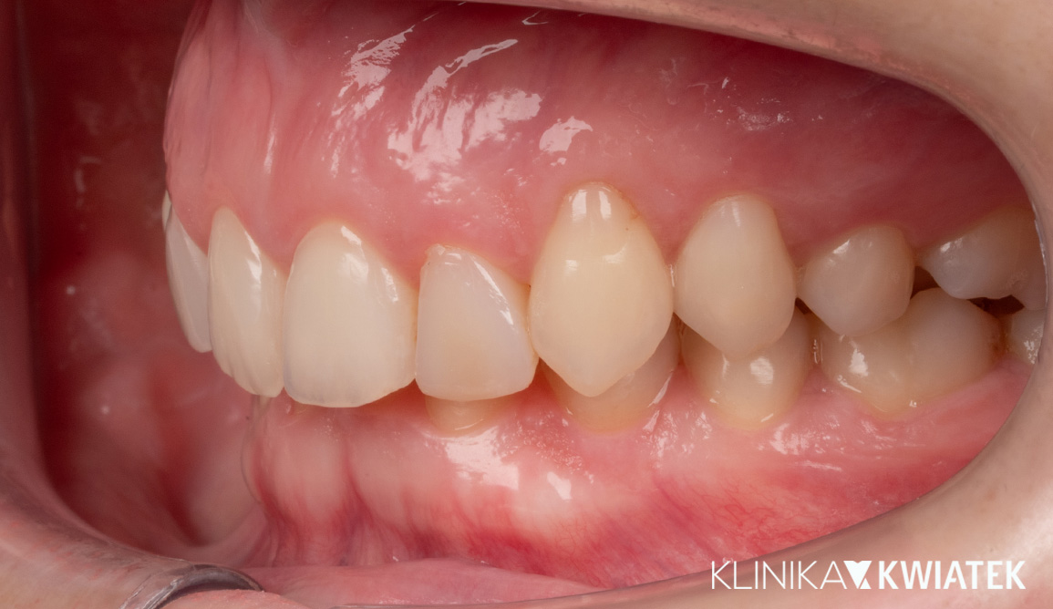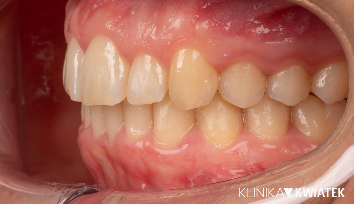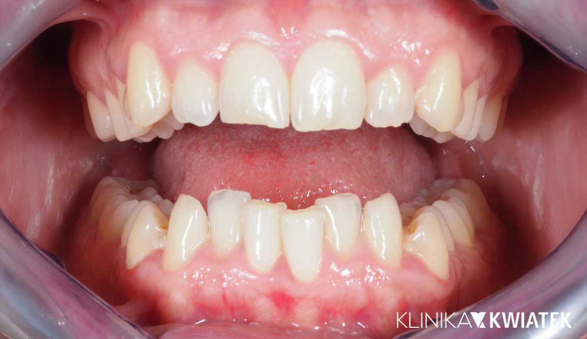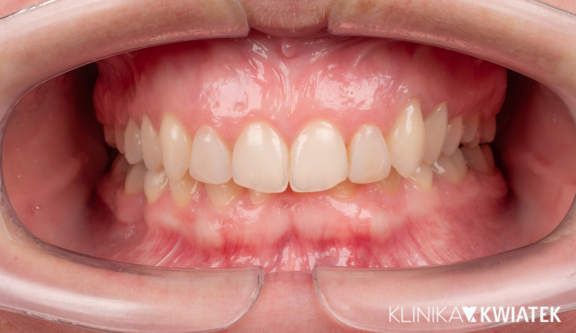 Pacjentka zgłosiła się do naszej kliniki z problemem zgryzu głębokiego, stłoczeniem zębów oraz licznymi ubytkami próchnicowymi. Po szczegółowej diagnostyce wdrożono kompleksowe leczenie zachowawcze, ortodontyczne i estetyczne. Dzięki interdyscyplinarnej opiece i zaangażowaniu zespołu specjalistów osiągnięto pełną rekonstrukcję funkcji żucia, stabilizację ortodontyczną oraz naturalny uśmiech.