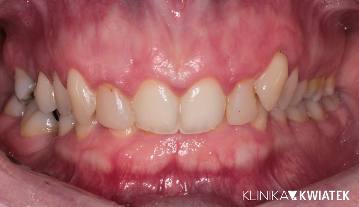 Pacjent zgłosił się do naszej kliniki z powodu braków zębowych oraz licznych problemów protetycznych w odcinku przednim. Dotychczasowe rozwiązania – mosty adhezyjne i korony – nie spełniały funkcji estetycznych ani mechanicznych. Dzięki kompleksowej diagnostyce i interdyscyplinarnemu leczeniu, przeprowadzono pełną rekonstrukcję z użyciem implantów, koron pełnoceramicznych oraz zaawansowanych zabiegów tkanek miękkich, przywracając Pacjentowi piękny, harmonijny uśmiech.