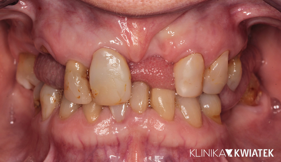 Pacjentka zgłosiła się z rozległymi brakami zębowymi oraz nieszczelnymi, nieestetycznymi pracami protetycznymi, które nie spełniały już swojej funkcji. Zależało jej na kompleksowej poprawie wyglądu uśmiechu, ale także na przywróceniu prawidłowej funkcji żucia i komfortu.
