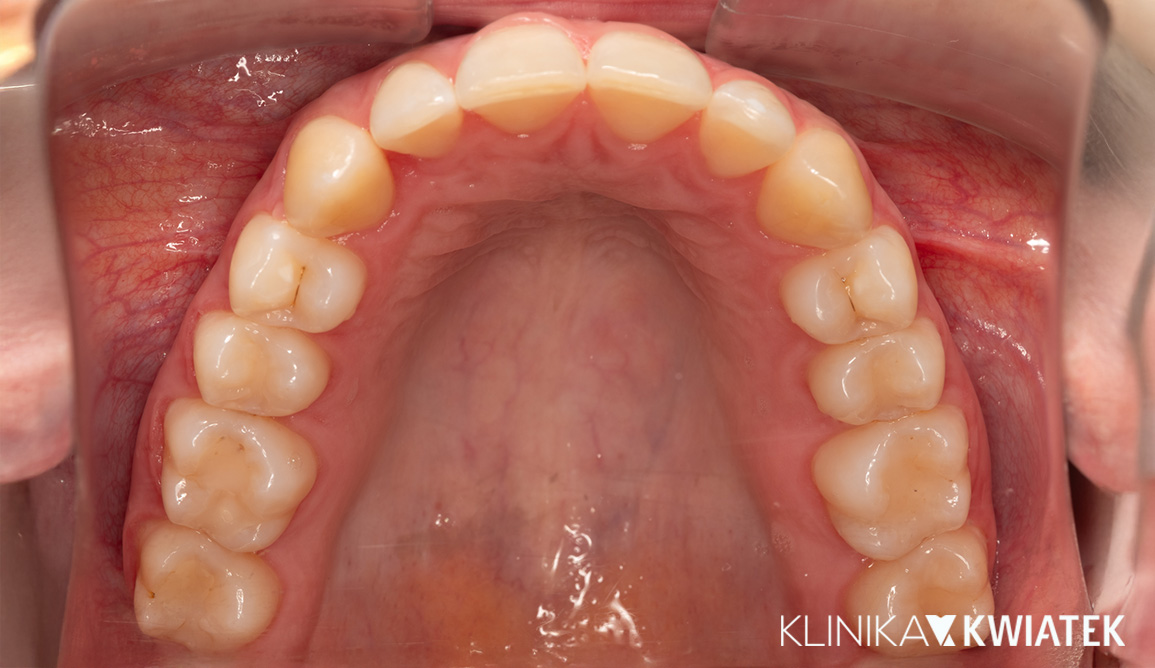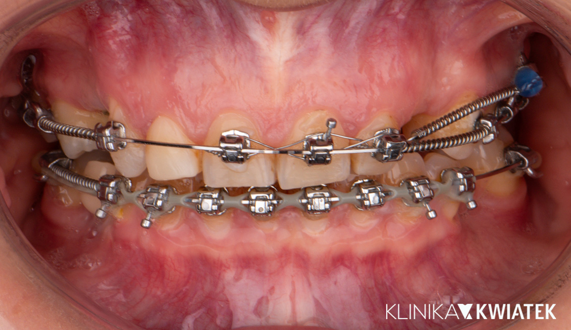 27 letnia Pacjentka zgłosiła się do naszej kliniki z problemem wyrzynającego się nieprawidłowo kła górnego, przesuniętą linią pośrodkową i powiększonym nagryzem pionowym. Dzięki kompleksowej diagnostyce, leczeniu ortodontycznemu z zastosowaniem aparatów estetycznych i metalowych, wsparciu fizjoterapeutycznemu oraz regularnym higienizacjom udało się uzyskać prawidłową funkcję i estetykę uśmiechu. Efektem końcowym jest harmonijny zgryz, stabilne utrzymanie rezultatów dzięki retencji oraz piękny, zdrowy uśmiech.