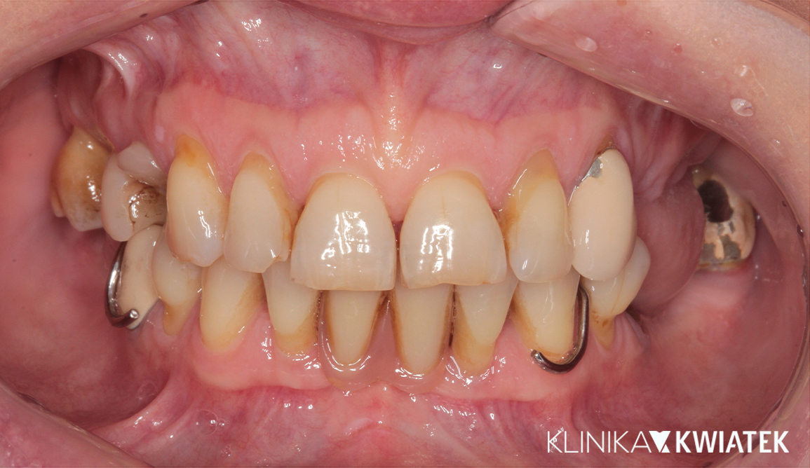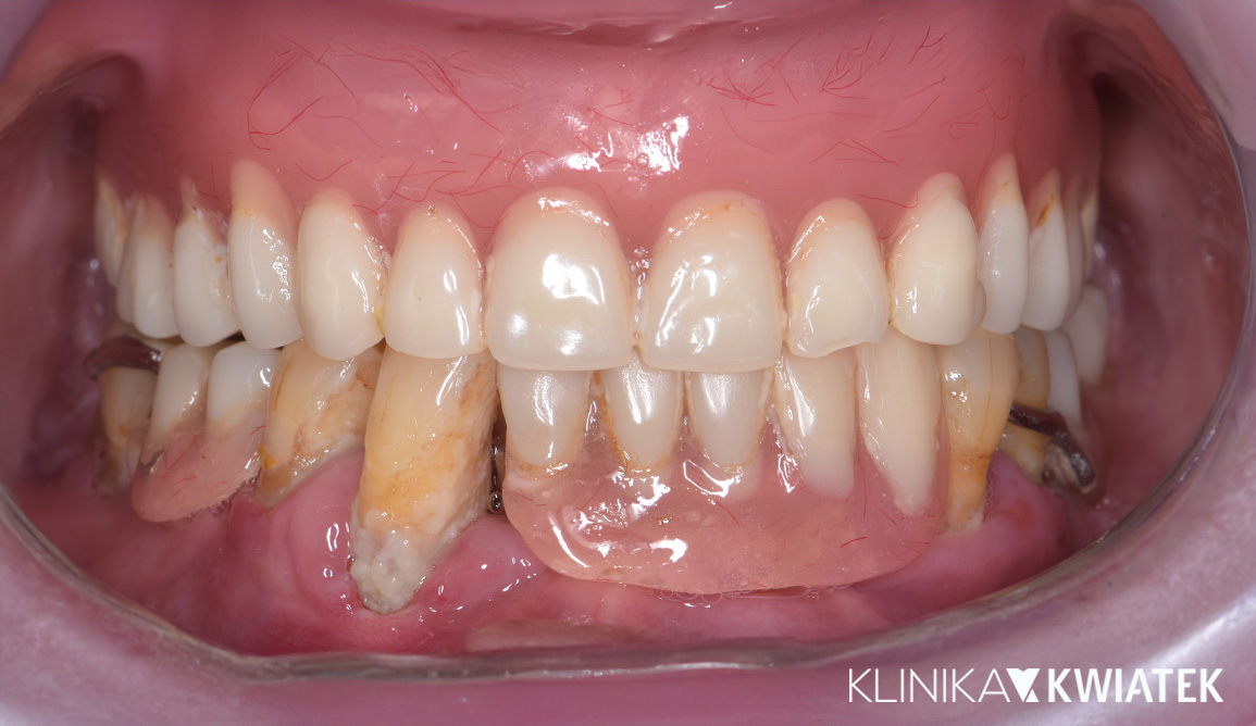 Pacjentka zgłosiła się z zaawansowaną chorobą przyzębia i znacznym zanikiem kości, co prowadziło do utraty wielu zębów. Po dokładnej diagnostyce wdrożono etapowe leczenie chirurgiczno-implantoprotetyczne z wykorzystaniem systemu MIS C1 oraz protezy szkieletowej. Efektem jest pełna odbudowa estetyki i funkcji żucia — komfort, stabilność i piękny, naturalny uśmiech.