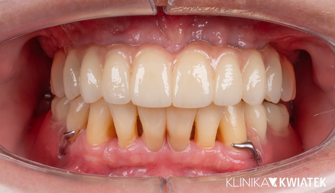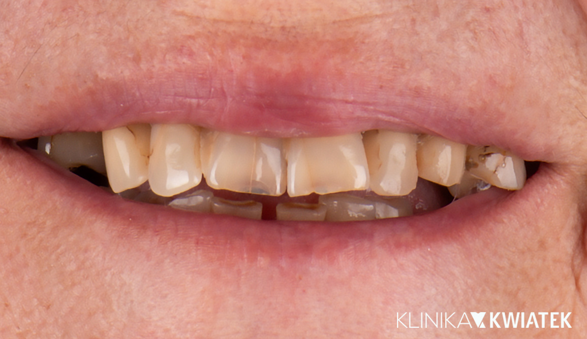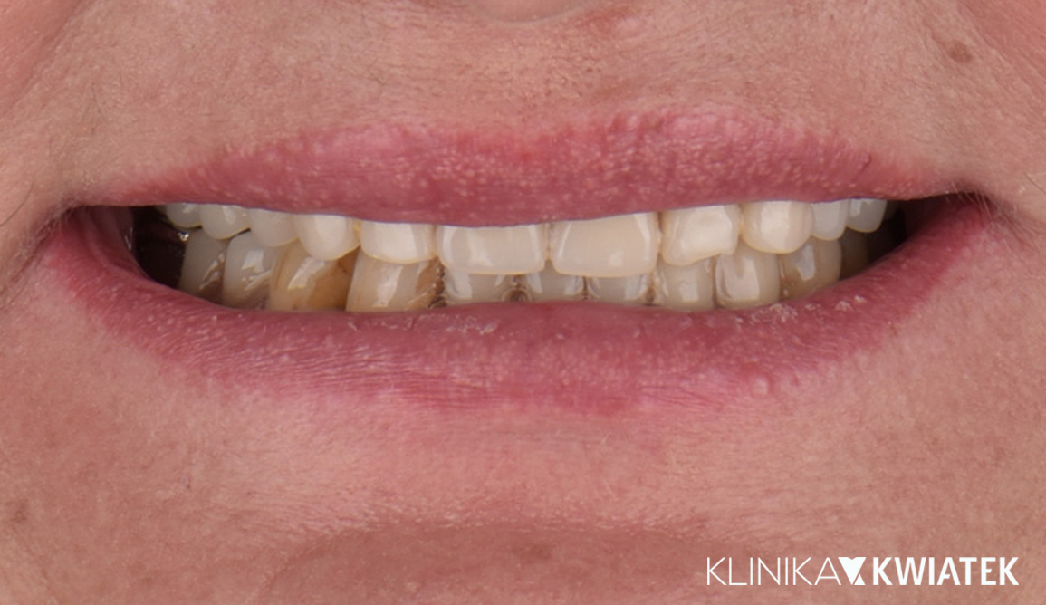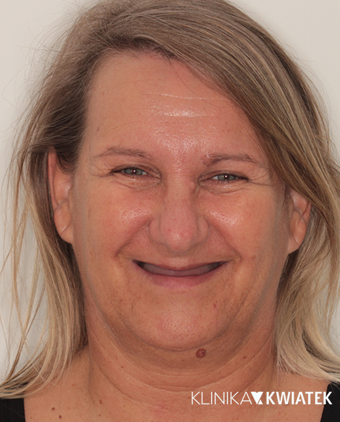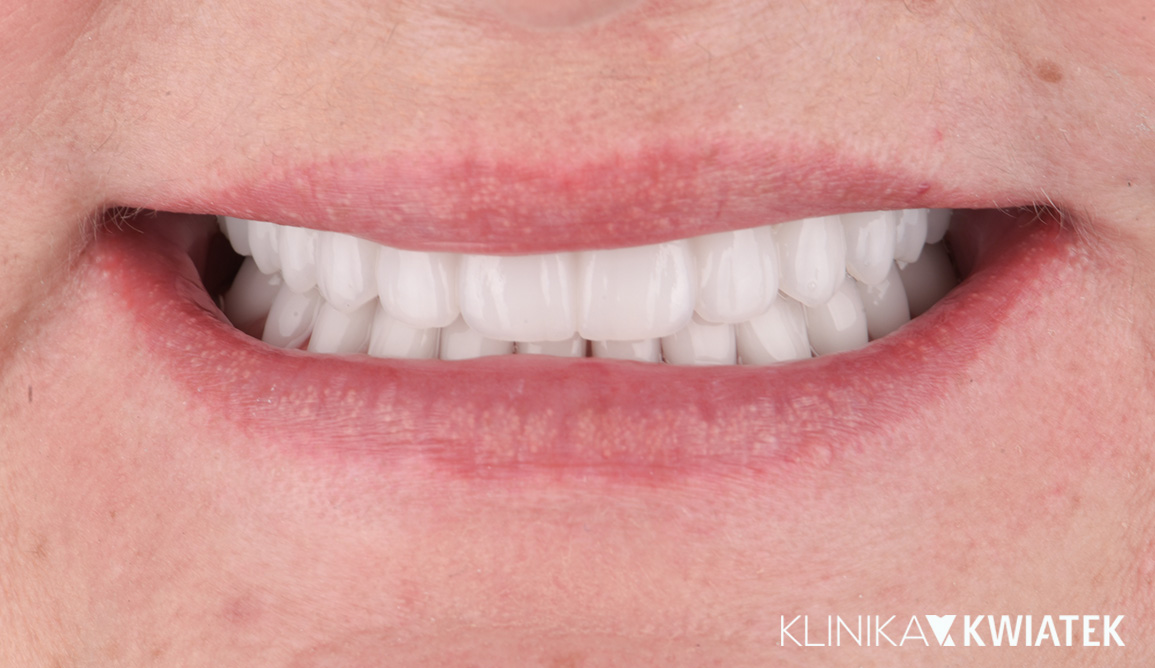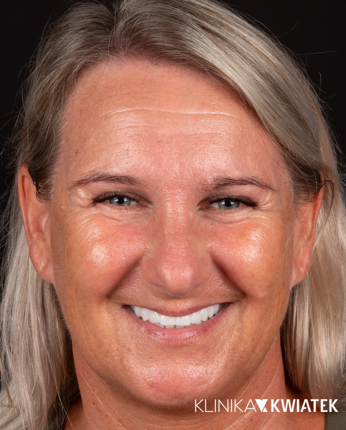 Nasza Pacjentka, Pani Małgorzata, przez lata użytkowała protezę szkieletową górną, która nie zapewniała jej oczekiwanego komfortu ani estetyki. Leczenie zaplanowaliśmy w dwóch etapach – najpierw pełna odbudowa dolnego łuku na implantach, a następnie kompleksowa rekonstrukcja szczęki w systemie all-on-6. Dzięki temu Pacjentka mogła pożegnać się z protezą ruchomą i cieszyć się stabilnym, estetycznym oraz w pełni funkcjonalnym uśmiechem.