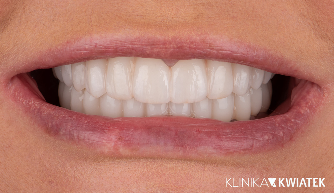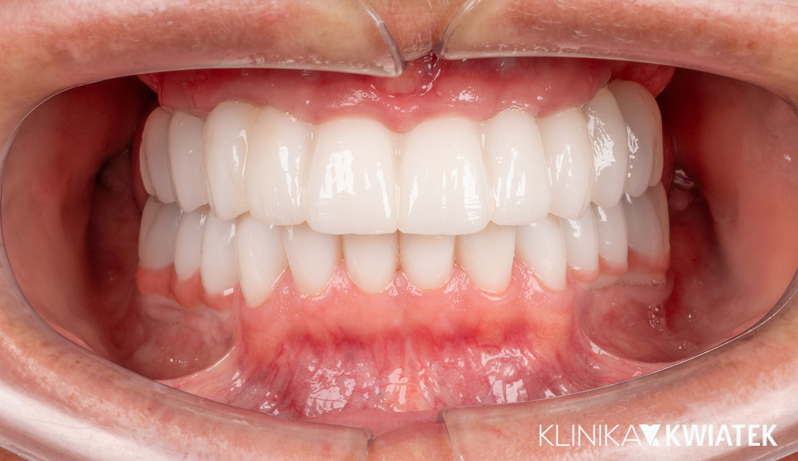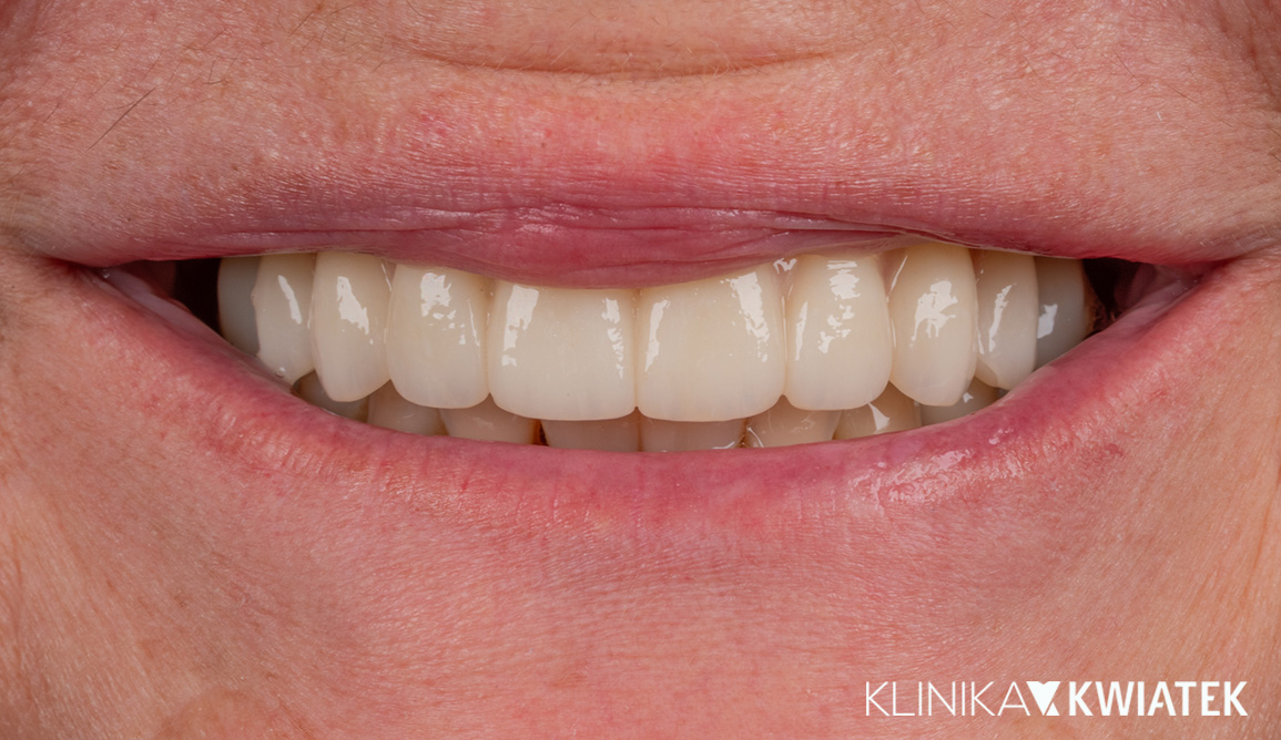Pan Krzysztof marzył o uśmiechu, który da mu pewność siebie i komfort życia – bez protez, bez kompromisów. Zakwalifikowano go do pełnołukowej odbudowy uśmiechu na implantach (All-on-6 / All-on-X), z natychmiastowym efektem estetycznym już tego samego dnia. Całość leczenia, od pierwszej wizyty po osadzenie ostatecznej pracy protetycznej, udało się zrealizować w zaledwie 4 miesiące. Efekt? Naturalny, trwały i piękny uśmiech, który wymaga teraz tylko jednej rzeczy – systematycznej higieny i kontroli, by cieszył przez długie lata.