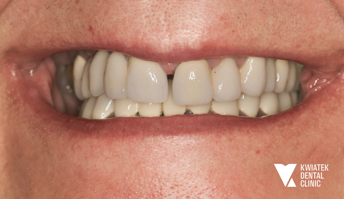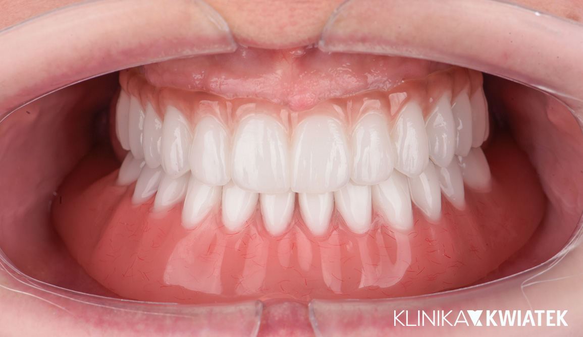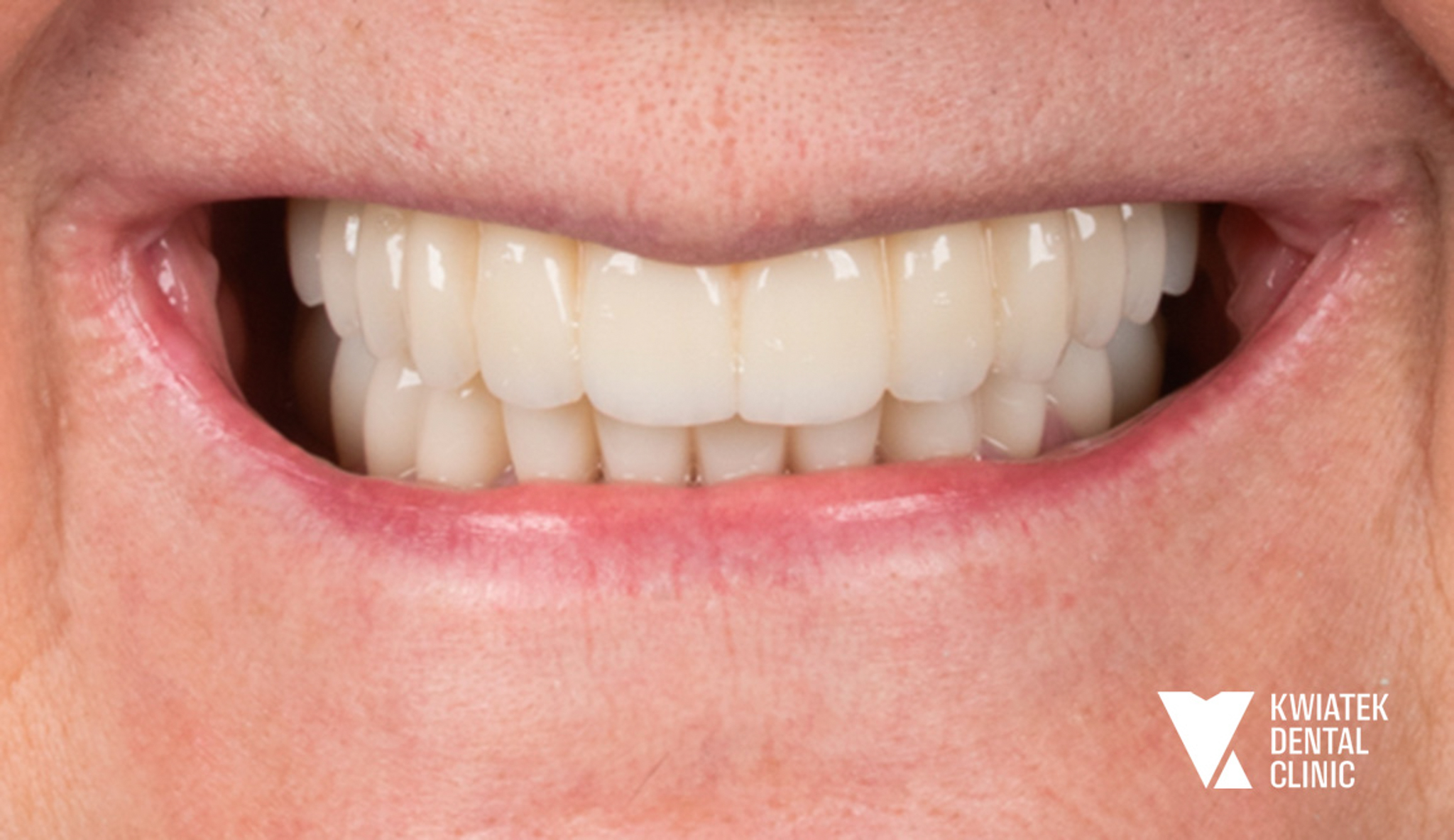 Pełna metamorfoza uśmiechu u Pacjenta, który dotąd korzystał z częściowej protezy. W łuku górnym wykonano odbudowę All-on-6, a dolny łuk zrekonstruowano za pomocą mostów na implantach i koron pełnoceramicznych. Efekt? Naturalny, stabilny uśmiech, który przywrócił pewność siebie i komfort na co dzień.