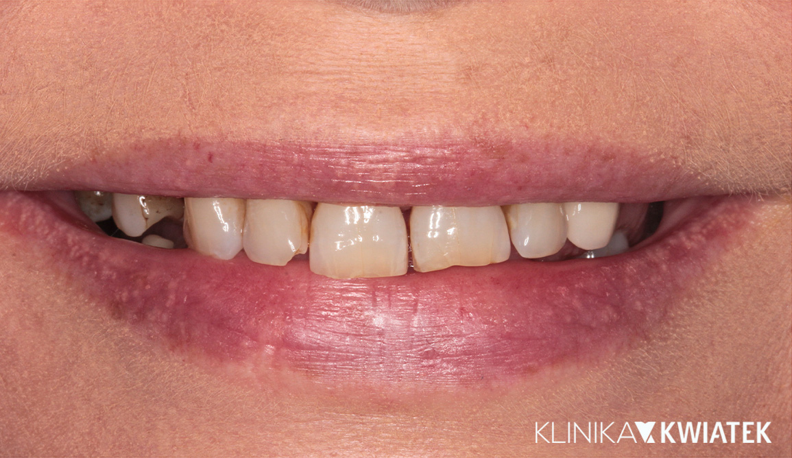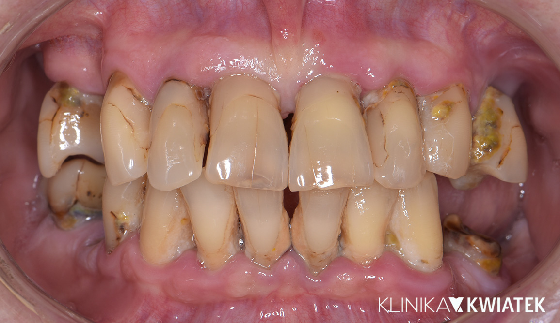Pacjentka zgłosiła się do kliniki w momencie, gdy wieloletnie uzupełnienia protetyczne utraciły swoją funkcję, a przewlekłe zmiany okołowierzchołkowe i ból zaczęły istotnie wpływać na komfort życia. Szczegółowa diagnostyka stała się punktem wyjścia do zaplanowania kompleksowego, wieloetapowego leczenia obejmującego terapię endodontyczną, chirurgiczną oraz implantologiczną, którego celem była pełna rehabilitacja jamy ustnej.