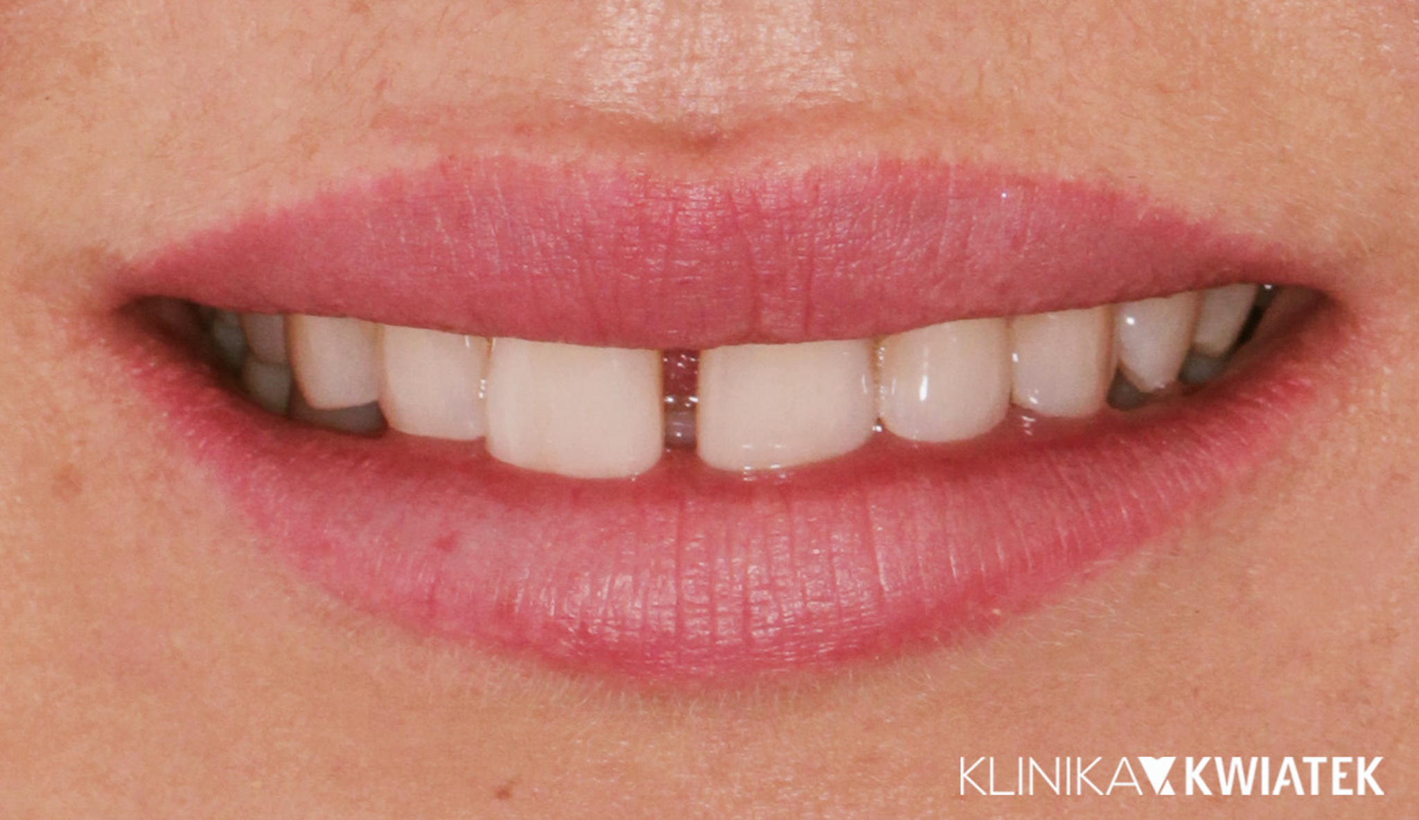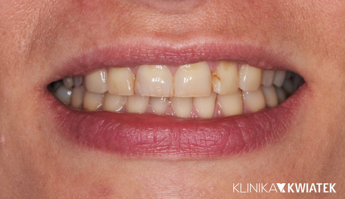 Do naszej kliniki zgłosiła się Pacjentka, która w przeszłości była już leczona ortodontycznie. Mimo wcześniejszego leczenia wciąż zmagała się z brakiem górnej dwójki oraz przesuniętą linią pośrodkową, co wpływało zarówno na estetykę uśmiechu, jak i na prawidłową funkcję zgryzu.
