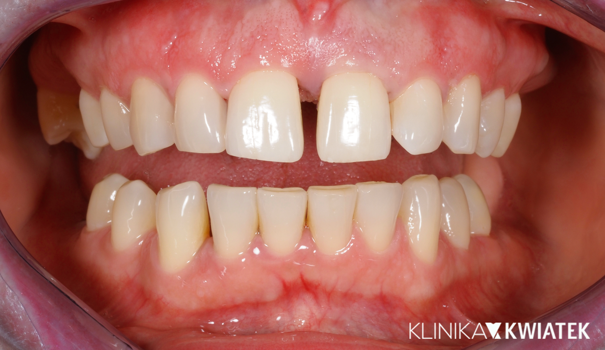Pacjentka zgłosiła się z problemem recesji dziąseł, wadą zgryzu, brakiem zawiązka zęba 34 oraz potrzebami leczenia zachowawczego. Terapia obejmowała wieloetapowe, kompleksowe leczenie: profesjonalne higienizacje, leczenie zachowawcze, ortodoncję nakładkową, zabiegi chirurgiczne oraz implantację z odbudową protetyczną. Efektem jest zdrowy, stabilny zgryz, prawidłowe warunki przyzębia oraz estetyczna i funkcjonalna odbudowa brakującego zęba.