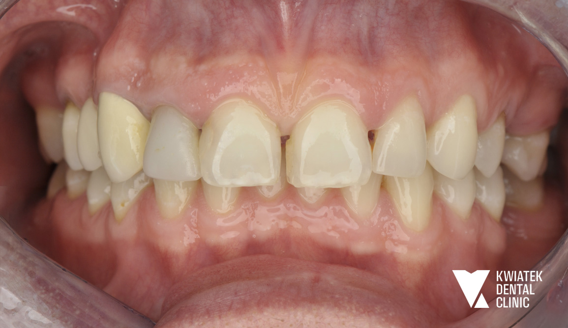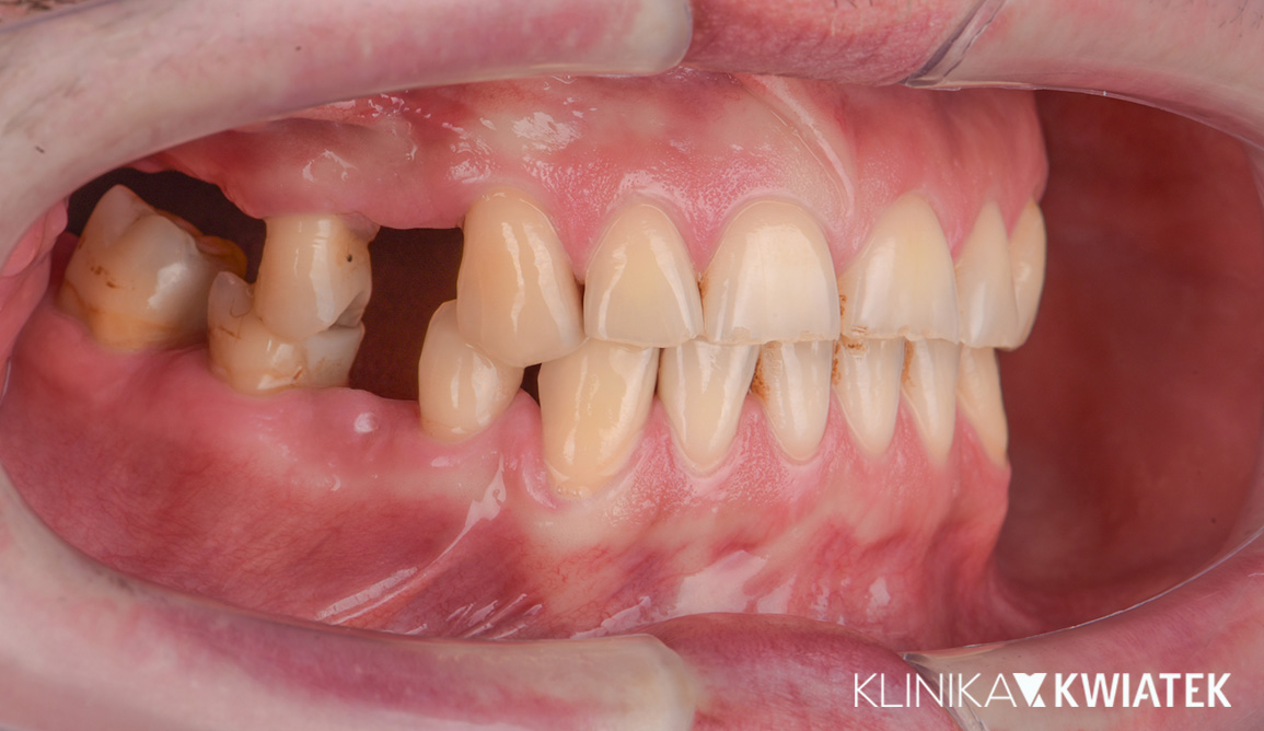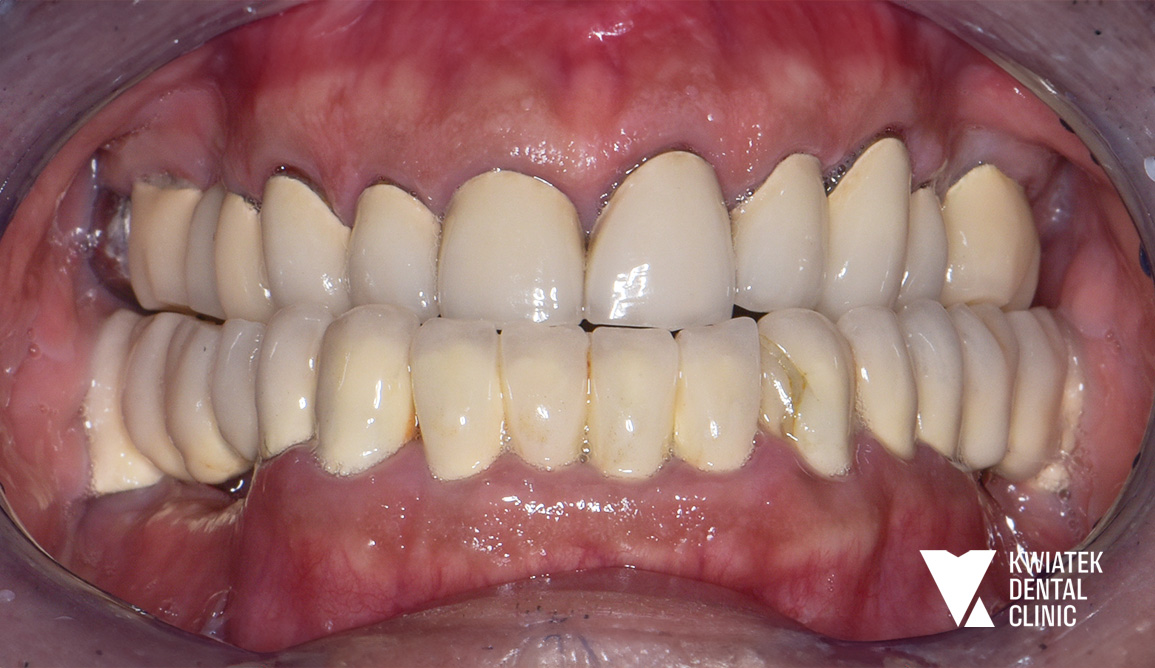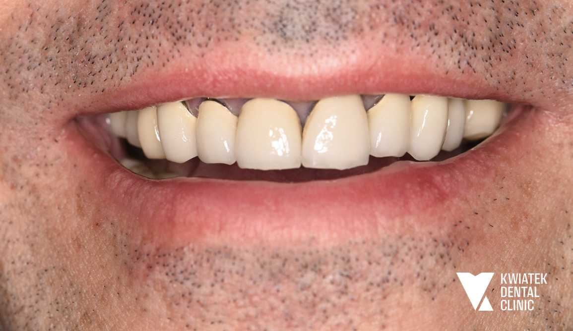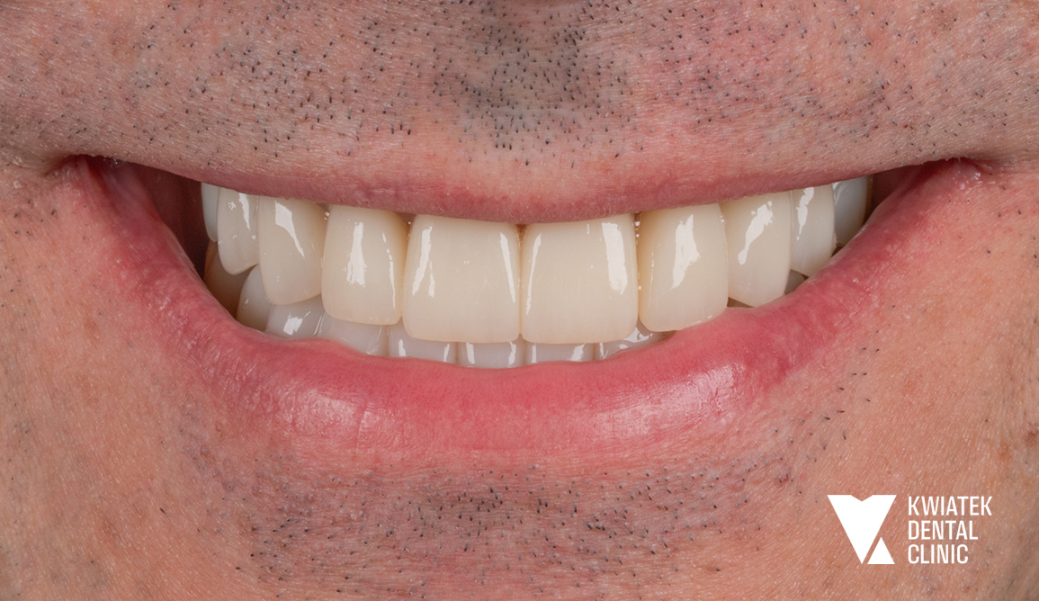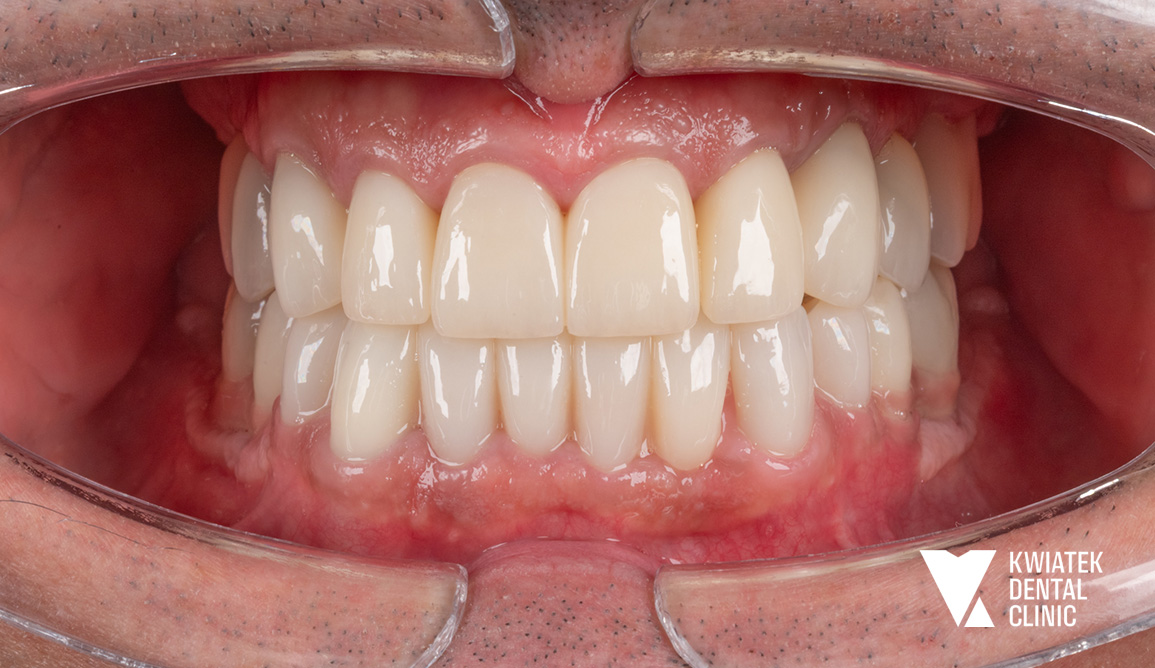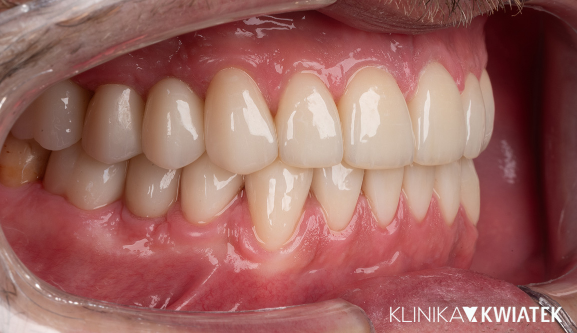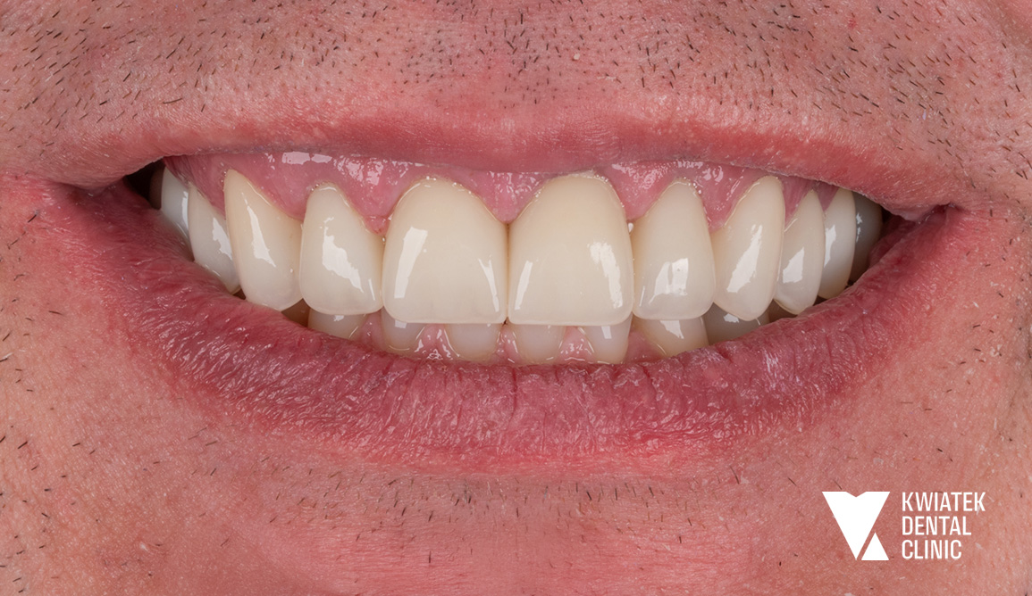 Pacjent zgłosił się z powodu ruszającego się mostu oraz bardzo starych koron wykonanych ponad 20 lat wcześniej, którym towarzyszyło znaczne obniżenie poziomu dziąseł i nieprawidłowe warunki zgryzowe. Leczenie obejmowało kompleksową diagnostykę, usunięcie przestarzałych prac, leczenie chirurgiczne, implantologiczne, endodontyczne oraz pełną rekonstrukcję protetyczną. Efektem jest stabilny, funkcjonalny i estetyczny uśmiech oparty na implantach oraz pełnoceramicznych koronach.