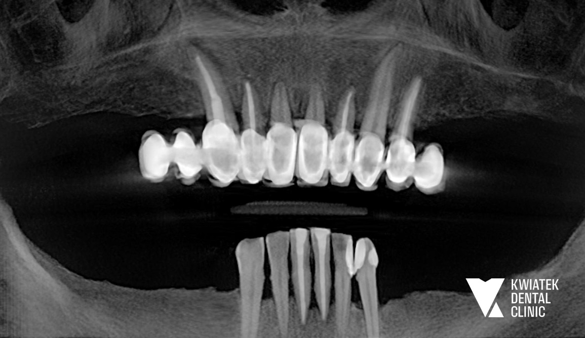 Pacjentka zgłosiła się do naszej kliniki z silnym bólem zębów przednich oraz zaawansowanym stanem zapalnym w obrębie kości szczęki. Diagnostyka wykazała torbiel zębopochodną wymagającą leczenia chirurgicznego oraz liczne problemy stomatologiczne obejmujące zarówno zęby, jak i zgryz. Dzięki kompleksowemu leczeniu obejmującemu chirurgię, implantologię, leczenie zachowawcze, protetykę i estetyczną rekonstrukcję udało się przywrócić Pacjentce zdrowie jamy ustnej, prawidłową funkcję zgryzu oraz naturalną estetykę uśmiechu.