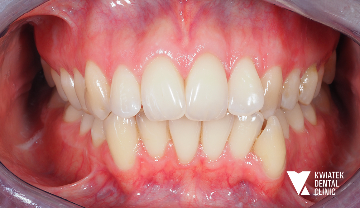 Pacjentka zgłosiła się do kliniki z potrzebą kompleksowej poprawy zarówno funkcji zgryzu, jak i estetyki uśmiechu. W badaniu stwierdzono zgryz krzyżowy, stłoczenia zębów oraz liczne problemy wymagające leczenia zachowawczego i protetycznego, co wymagało wieloetapowego, interdyscyplinarnego podejścia. Terapię poprzedziło staranne przygotowanie jamy ustnej obejmujące ekstrakcję zębów mądrości, profesjonalną higienizację oraz odbudowę osłabionych struktur. Następnie wdrożono zaawansowane leczenie ortodontyczne z wykorzystaniem nowoczesnego systemu nakładkowego. Rezultatem jest harmonijny, stabilny zgryz, idealnie ukształtowane łuki zębowe oraz wyraźnie odmłodzony, jasny uśmiech, podkreślony profesjonalnym wybielaniem.