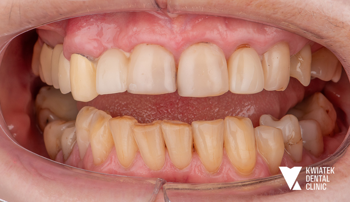 Dzięki ogromnej determinacji Pacjenta, który pomimo dużej odległości regularnie przyjeżdżał na zaplanowane wizyty, możliwe było przeprowadzenie kompleksowego leczenia, którego efektem jest doskonale zbalansowany zgryz oraz spektakularna i w pełni naturalna metamorfoza uśmiechu.