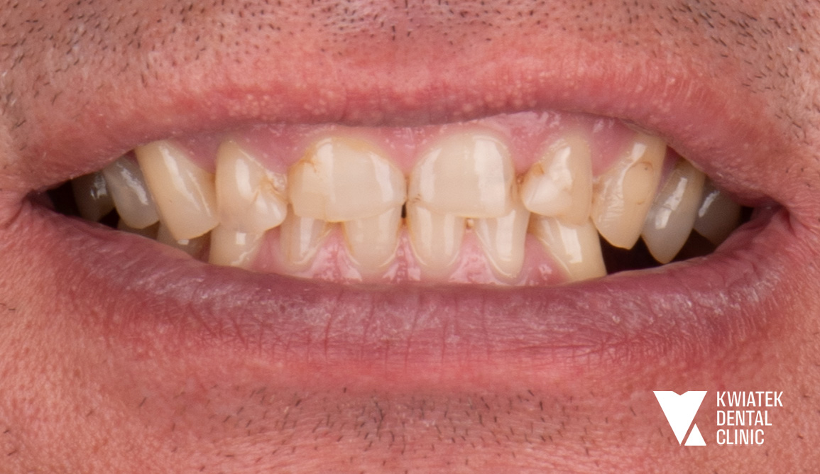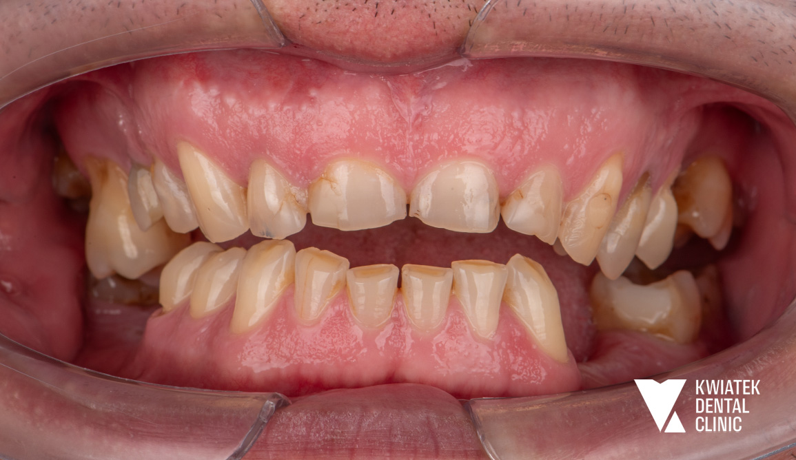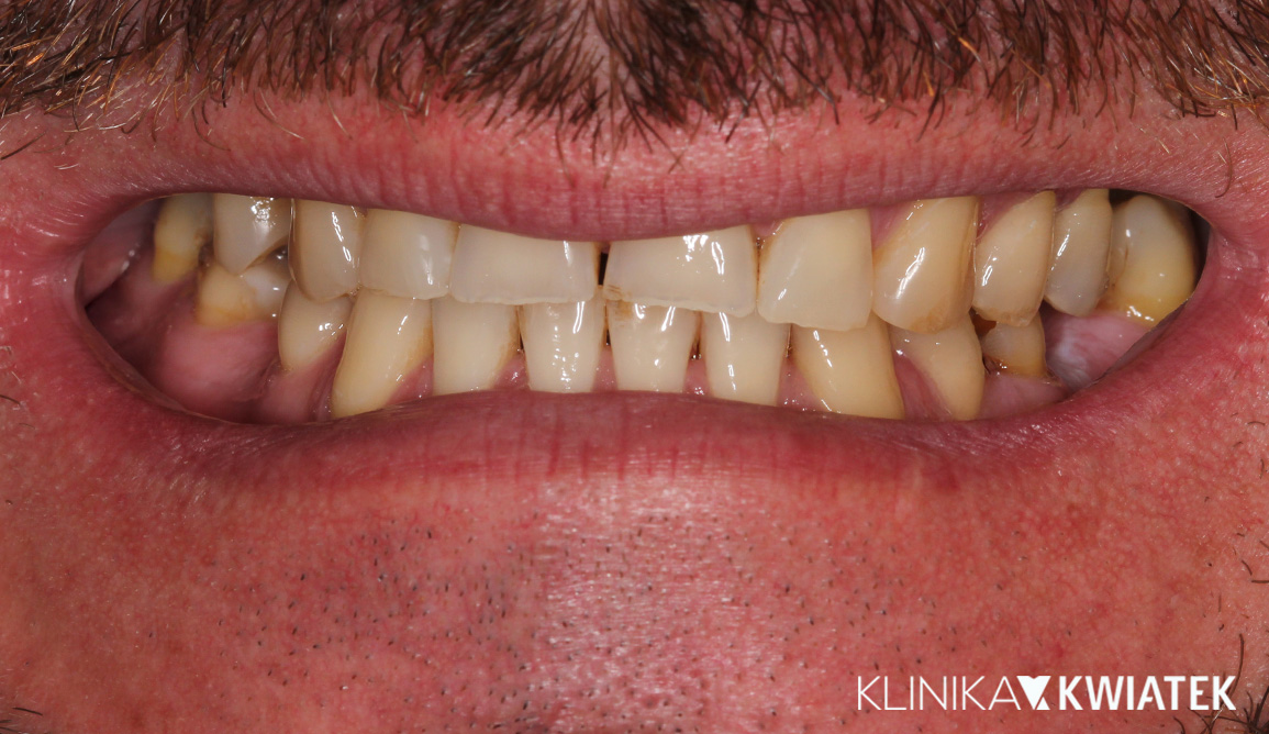 Pacjent zgłosił się z nasilonym starciem zębów, zaciskaniem oraz odwróconą linią uśmiechu. Towarzyszyły temu rozległe ubytki  próchnicowe i zęby wymagające ponownego leczenia kanałowego. Zaprojektowaliśmy kompleksową, interdyscyplinarną rehabilitację jamy ustnej - od leczenia zachowawczego i chirurgii periodontologicznej, przez nawigowaną implantologię, po pełną odbudowę protetyczną.