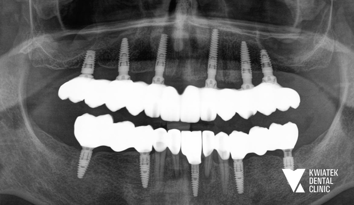 Pełna metamorfoza uśmiechu u Pacjenta, który dotąd korzystał z częściowej protezy. W łuku górnym wykonano odbudowę All-on-6, a dolny łuk zrekonstruowano za pomocą mostów na implantach i koron pełnoceramicznych. Efekt? Naturalny, stabilny uśmiech, który przywrócił pewność siebie i komfort na co dzień.