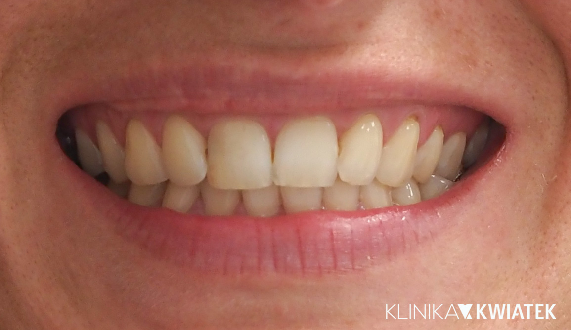 Pacjentka zgłosiła się z problemem stłoczenia zębów, zgryzu krzyżowego i asymetrii linii pośrodkowej. Po szczegółowej diagnostyce wdrożono leczenie nakładkami Spark, które przywróciło prawidłowe ustawienie zębów i symetrię uśmiechu. Zwieńczeniem terapii była odbudowa estetyczna metodą flow injection oraz wydłużenie koron klinicznych – efekt to naturalny, harmonijny uśmiech o zdrowym i jasnym odcieniu.