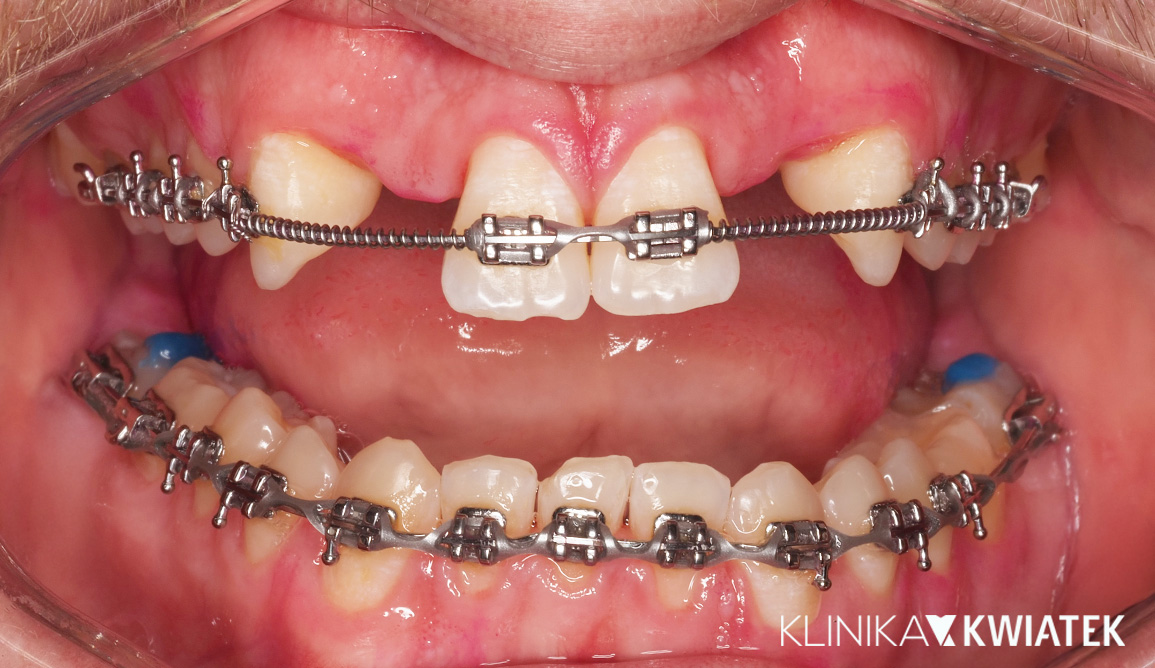 Pacjent zgłosił się do naszej kliniki w trakcie trwającego leczenia ortodontycznego prowadzonego w innej placówce. Celem była rekonstrukcja brakujących zębów siecznych bocznych w odcinku górnym (12 i 22). Po dokładnej diagnostyce zaplanowano i wykonano zabieg implantacji z augmentacją kości w technologii cyfrowej, a następnie odbudowę koronami ceramicznymi na indywidualnych łącznikach cyrkonowych. Efekt – naturalny, symetryczny uśmiech i pełna harmonia zębów po zakończonej ortodoncji.