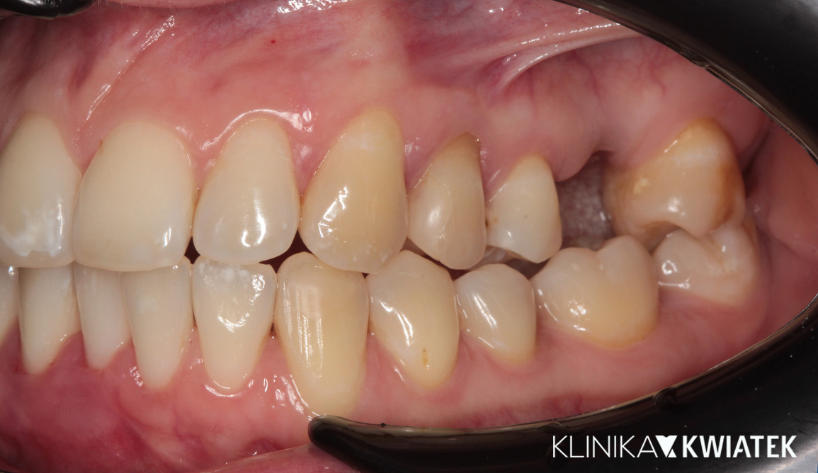 Pacjentka zgłosiła się do kliniki po zakończeniu leczenia ortodontycznego nakładkami w innym gabinecie, w celu odbudowy brakującego zęba trzonowego. Po szczegółowej diagnostyce zaplanowano leczenie implantologiczne, protetyczne oraz periodontologiczne. Dzięki precyzyjnej pracy zespołu specjalistów uzyskano pełną odbudowę estetyki i funkcji – naturalny, harmonijny uśmiech oraz zdrowe, stabilne przyzębie.