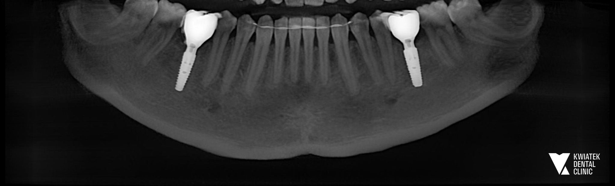 Zabieg implantologiczny został przeprowadzony zgodnie z wcześniej przygotowanym planem. W trakcie procedury zastosowano nowoczesny system implantologiczny MIS C1. W pierwszym etapie wykonano augmentację kości z wykorzystaniem materiału kościozastępczego Bio-Oss oraz kości własnej Pacjentki, co pozwoliło na optymalne przygotowanie podłoża kostnego pod implanty. Następnie wszczepiono dwa implanty w znieczuleniu miejscowym przy użyciu szablonu chirurgicznego, co zapewniło maksymalną precyzję pozycjonowania implantów. W trakcie zabiegu wykonano również śródzabiegową kontrolę radiologiczną RVG oraz badanie CBCT żuchwy. W tym przypadku po implantacji założono śruby gojące, a tkanki miękkie zabezpieczono szwami chirurgicznymi. Pacjentce przekazano szczegółowe zalecenia pozabiegowe oraz wdrożono odpowiednie leczenie farmakologiczne.