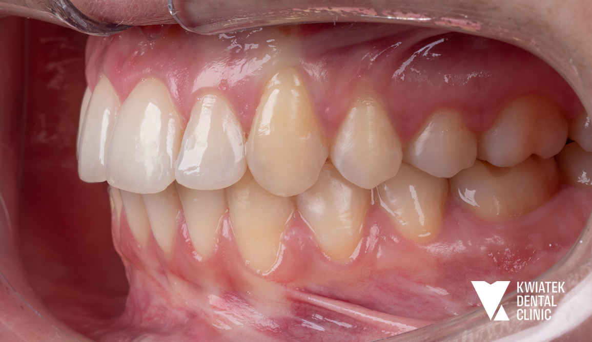 Po zakończeniu etapu przygotowawczego przeprowadzono zabieg ortognatyczny BSSO (Bilateral Sagittal Split Osteotomy: obustronna strzałkowa osteotomia żuchwy), czyli operację polegającą na precyzyjnym przemieszczeniu żuchwy do jej prawidłowej pozycji. W trakcie zabiegu chirurg wykonuje kontrolowane rozdzielenie kości żuchwy, a następnie ustawia ją w optymalnym położeniu względem szczęki i stabilizuje. Dzięki temu możliwe było nie tylko uzyskanie prawidłowych relacji szkieletowych, ale również poprawa proporcji twarzy oraz funkcji całego układu żucia.