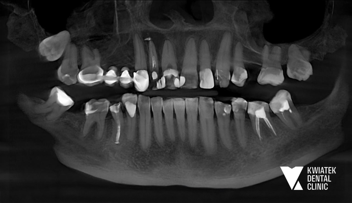 Pacjentka zgłosiła się do naszej kliniki z powodu silnych dolegliwości bólowych w obrębie przedniego odcinka szczęki. Leczenie kanałowe jednego z zębów było wcześniej rozpoczęte w innym gabinecie, jednak pomimo kilku wizyt dolegliwości nie ustępowały. W trakcie konsultacji klinicznej stwierdzono bolesność zębów, ich zwiększoną ruchomość oraz objawy wskazujące na proces zapalny w tkankach okołowierzchołkowych. Ze względu na złożoność problemu podjęto decyzję o przeprowadzeniu pełnej diagnostyki oraz zaplanowaniu kompleksowego leczenia.