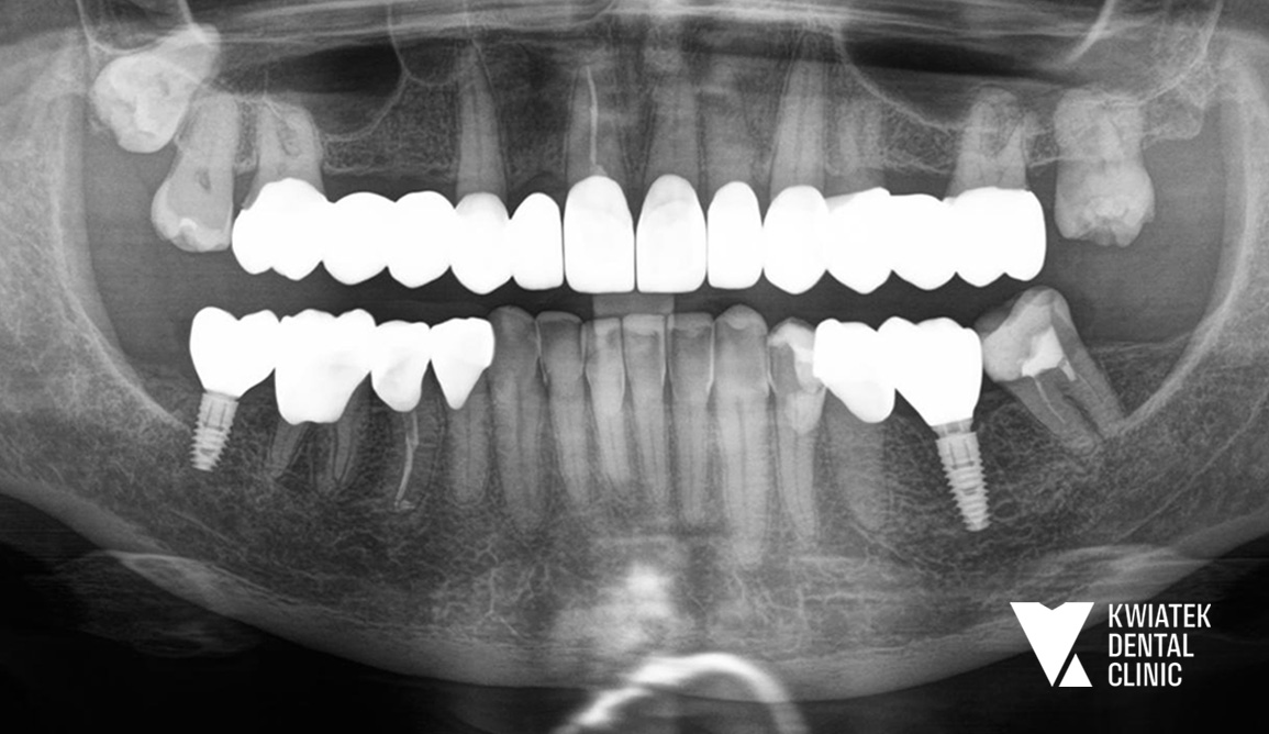 Efektem leczenia jest kompleksowa odbudowa zdrowia jamy ustnej oraz harmonijna poprawa estetyki uśmiechu Pacjentki. Usunięto ognisko infekcji, odbudowano brakujące zęby z wykorzystaniem implantów i przywrócono prawidłową funkcję zgryzu.