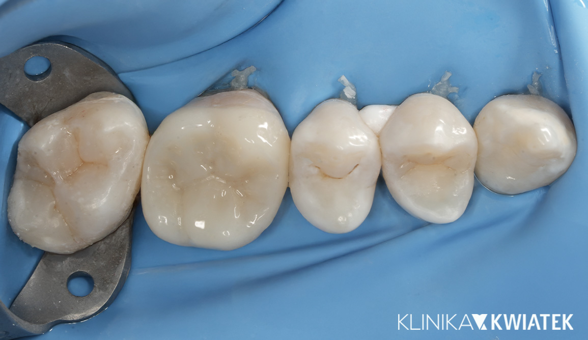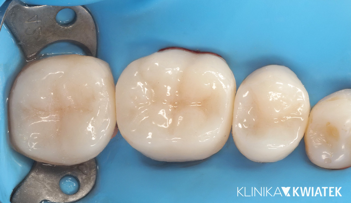 U Pacjenta po leczeniu kanałowym górna szóstka została odbudowana porcelanowym overlay’em z dwukrzemianu litu – materiału o wysokiej estetyce, szczelności i trwałości.