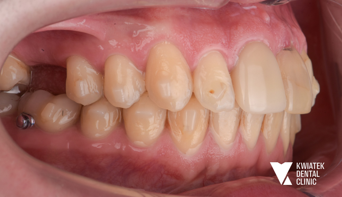 Efektem leczenia jest kompleksowa odbudowa funkcji narządu żucia oraz estetyki uśmiechu. Uzyskano prawidłowe relacje zgryzowe, poprawę symetrii łuków zębowych oraz stabilne warunki pod odbudowy protetyczne. Implanty zapewniły trwałe uzupełnienie braków zębowych, a leczenie ortodontyczne umożliwiło harmonijne ustawienie zębów.