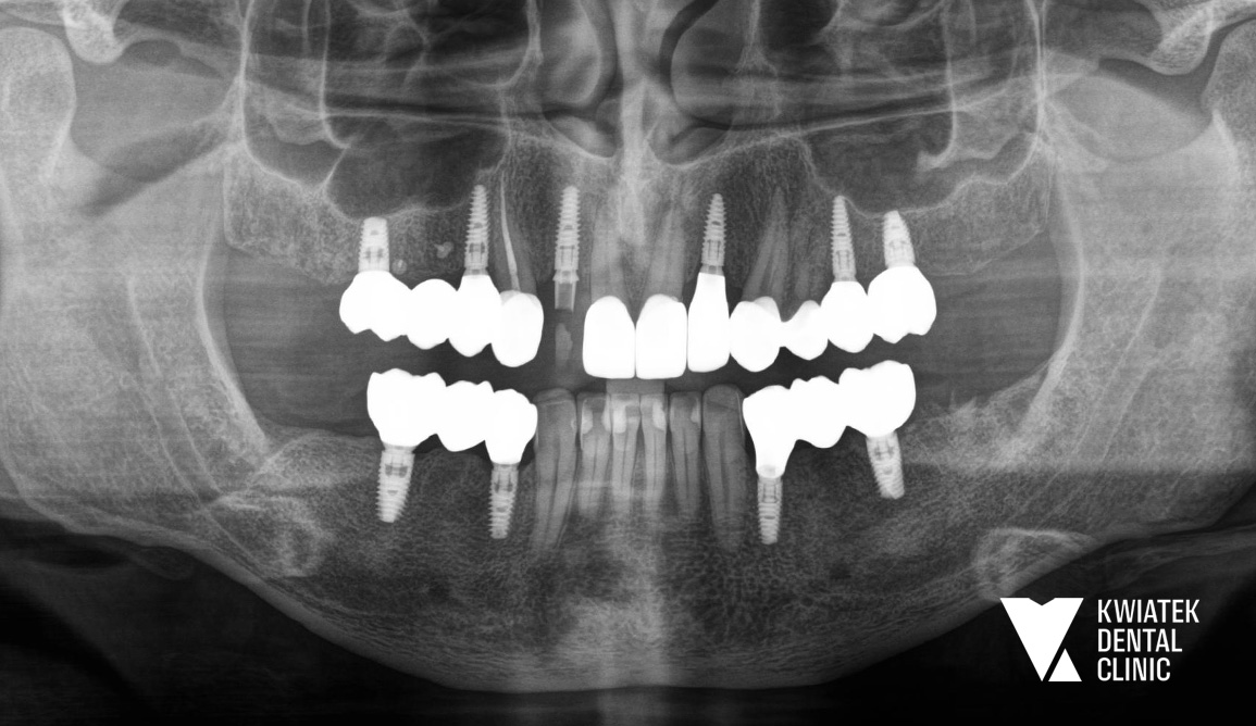 Po integracji implantów wykonano korony ceramiczne na implantach oraz korony pełnoceramiczne na zębach własnych, dzięki czemu cały uśmiech zyskał harmonijny, estetyczny wygląd.