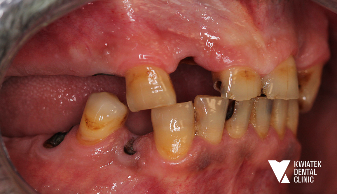 Pacjent zgłosił się do naszej Kliniki z potrzebą całościowego przywrócenia funkcji i estetyki uzębienia. Leczenie rozpoczęliśmy od profesjonalnej higienizacji, aby usunąć złogi nazębne oraz płytkę bakteryjną, co stworzyło prawidłowe warunki do dalszych zabiegów.